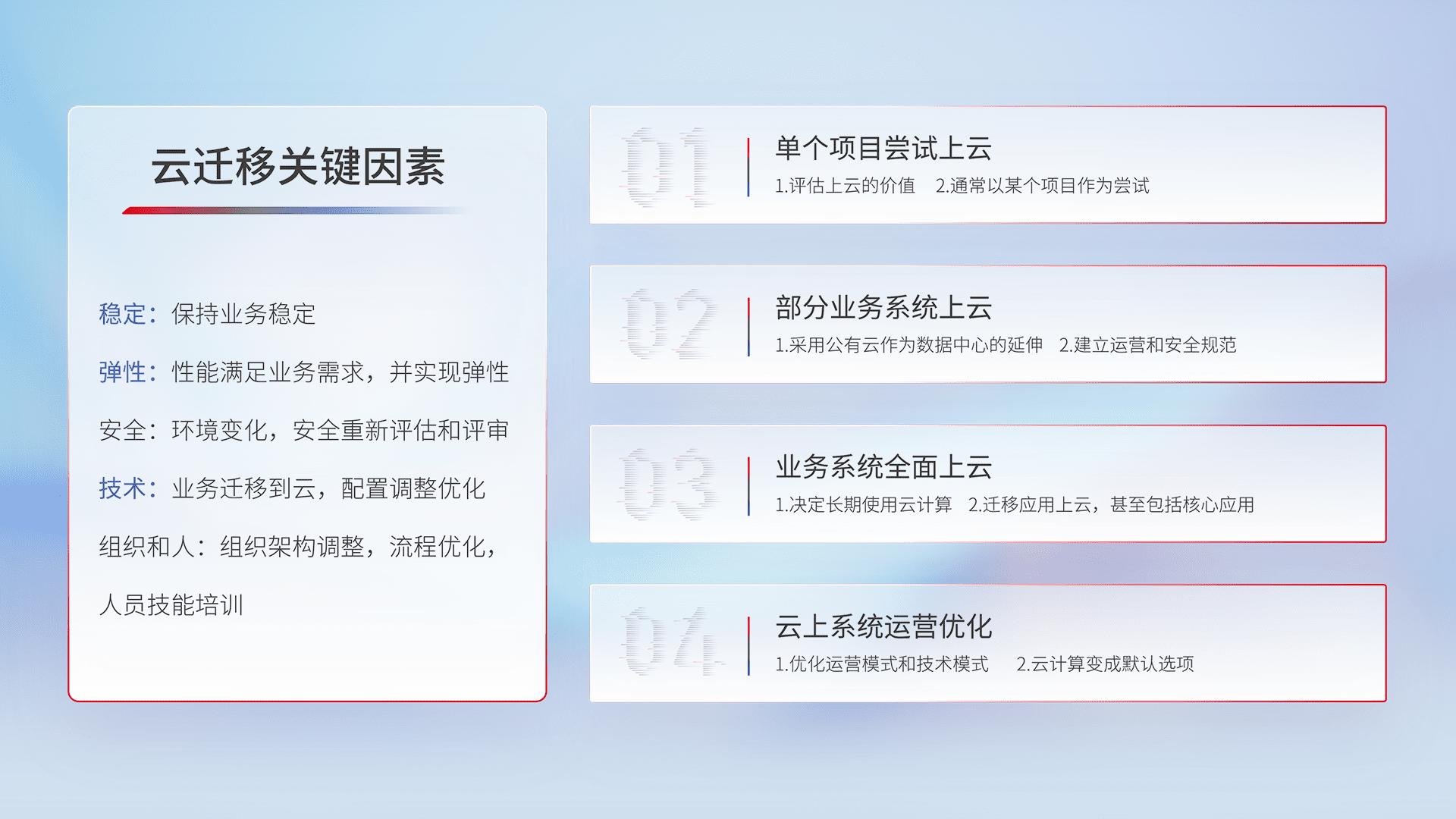 结合实际业务,,从规划设计、、、、云平台选型、、、、云原生改造、、数据迁移、、、、集成交付,,,,迁移全过程为客户识别最佳上云路径,,,做好风险识别管理,,,,设计网络架构、、、、身份权限、、、、安全审计合规、、、、操作审计、、、日志审计、、、、监控告警策略、、、、多站点容灾设计等,,,对云上基础设施进行整体规划,,,,提升IT治理水平,,,,以满足弹性、、高可用、、、、高性能的需求。。