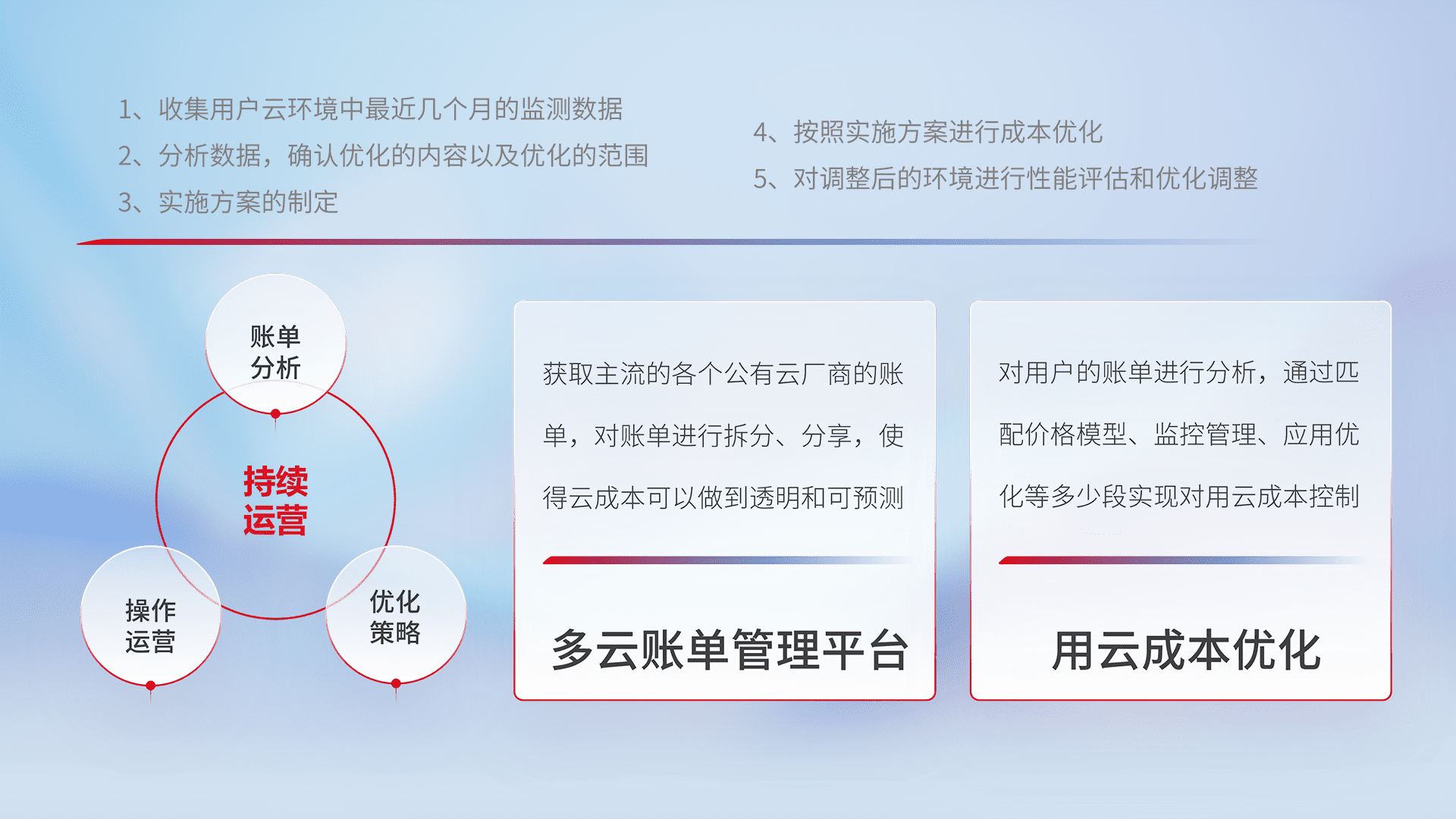 通过多云纳管,,,以统一的资源数据模型把客户的云资源进行抽象和封装,,进而实现对多云资源的统一操作,,保障云资源管理的可靠性、、稳定性与可用性。。量身定制化运维内容,,,配置、、、开发运维、、、补丁管理、、备份、、监控、、认证和访问管理、、、审计和日常巡检等,,,,保障在用云过程中的可靠度,,,稳定度以及高可用率。。。